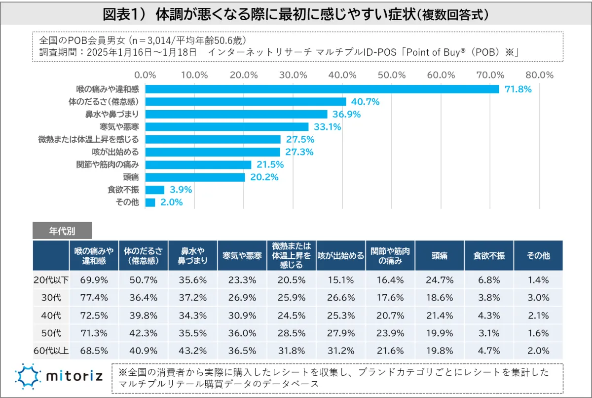 調査の結果、体調不良を最初に感じる症状は「喉の痛みや違和感」が71.8%で最も多く、次いで「倦怠感」が40.7%、さらに「鼻水や鼻づまり」が36.9%という結果が出ました。特に、年代別に見ると「咳が出始める」という症状は、年齢が上がるとともに割合が高まる傾向が見られ、若年層が咳を気にする割合は少ないようです。