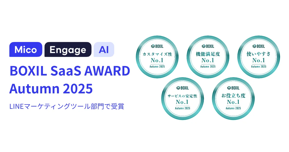 株式会社Micoが提供するLINEマーケティングプラットフォーム「Mico Engage AI」が、スマートキャンプ主催の「BOXIL SaaS AWARD Autumn 2025」でLINEマーケティングツール部門において「Good Service」を受賞しました。この受賞は、同プラットフォームが顧客エンゲージメントを高めるために優れた機能を実現していることを示しています。