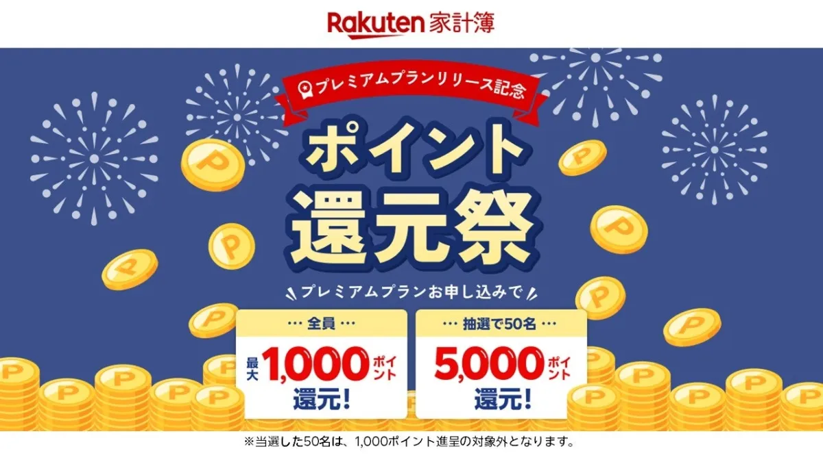 楽天家計簿、プレミアムプラン開始記念を祝うポイント還元祭