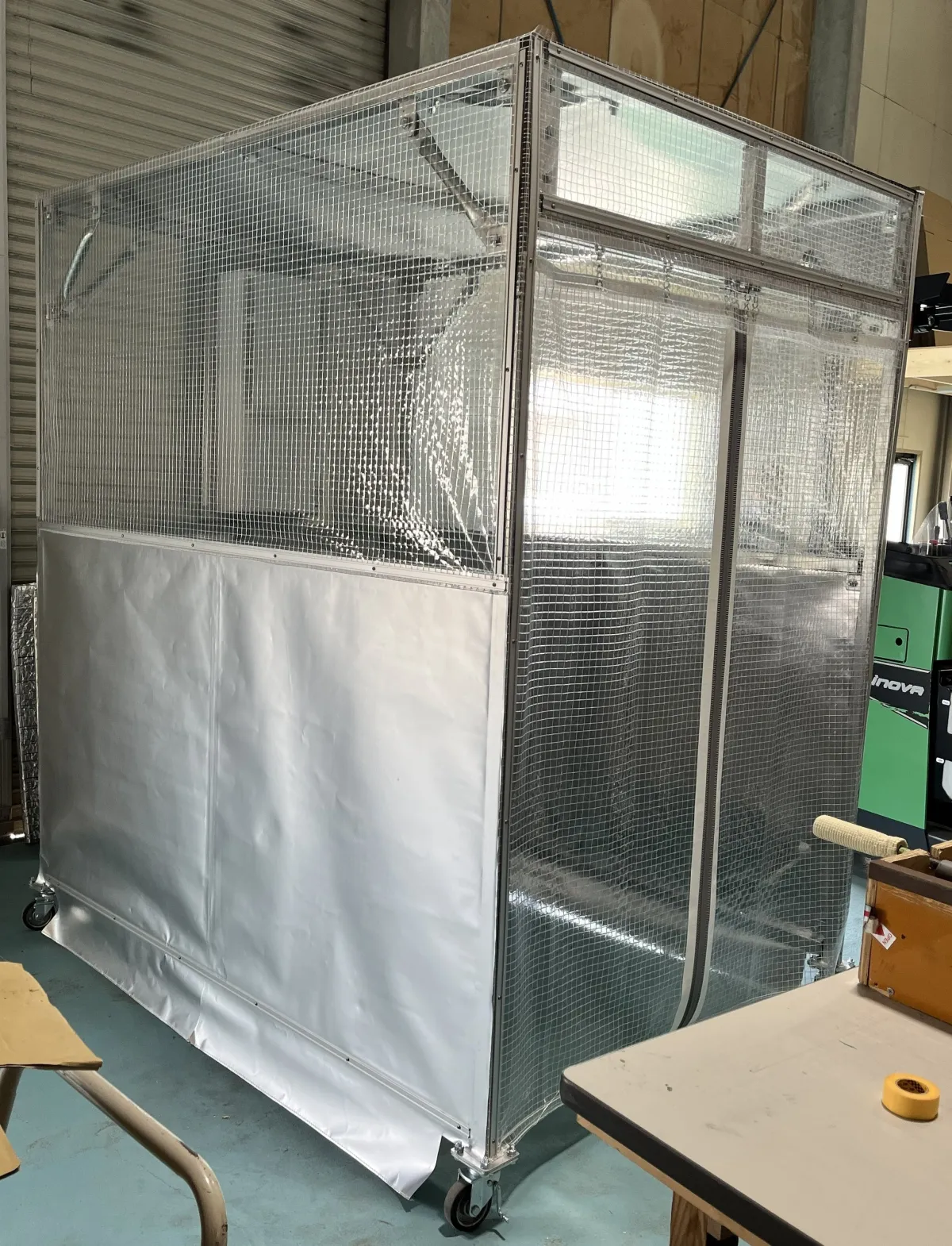 この製品は、EMW遮熱シート®を使用し、外部からの熱を効果的に遮断します。天井部分や壁面には、この先進的なシートが貼られ、97%以上の輻射熱を防ぎます。また、透明のビニールカーテンも導入され、快適な冷暖房機能を持ったエアコンも備えています。