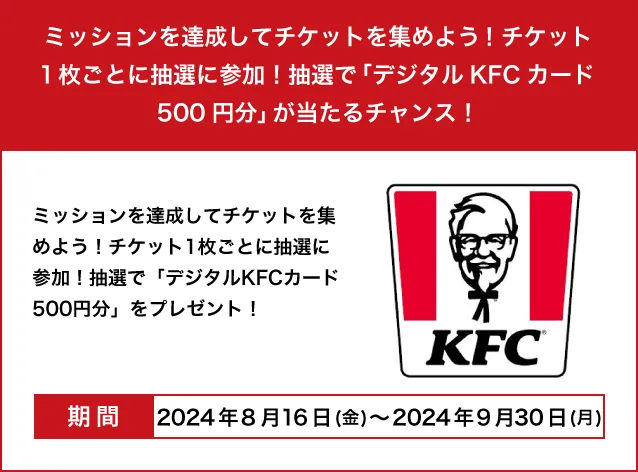 ユーザーは、アプリ内のミッションをクリアすることによって獲得したチケットを使い、抽選に申し込むことが可能です。各チケットで一度の抽選に参加できるため、チャンスは広がります。抽選は即時に行われ、当選者にはケンタッキーフライドチキン(KFC)で使えるデジタルKFCカードが提供されました。なお、このキャンペーンは現在は終了していますが、多くのユーザーに利用いただき、大きな反響を得ました。