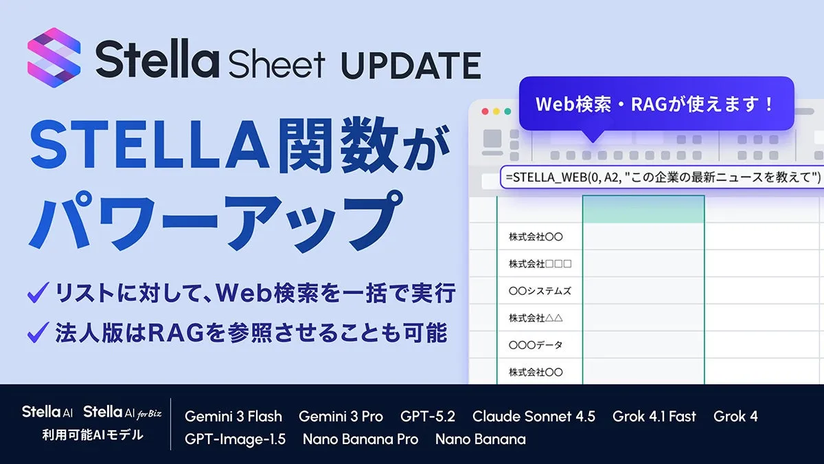 業務における生産性向上は、企業にとって常に重要なテーマです。株式会社SUPERNOVAが展開する生成AIサービス「Stella AI」と「Stella AI for Biz」には、最近新たに「STELLA_WEB関数」と「STELLA_RAG関数」が追加され、これによりExcelの業務で何が変わるのでしょうか。