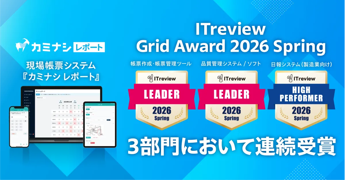 株式会社カミナシが提供している現場帳票システム『カミナシ レポート』が、2026年4月に実施された「ITreview Grid Award 2026 Spring」において、連続で3つの部門で高評価を受けました。特に目を引くのは、「帳票作成・帳票管理ツール」および「品質管理システム/ソフト」部門での指標として最高の称号「Leader」を、8期連続で受賞したことです。また、「日報システム(製造業向け)」部門では「High Performer」賞を7期連続で獲得しています。