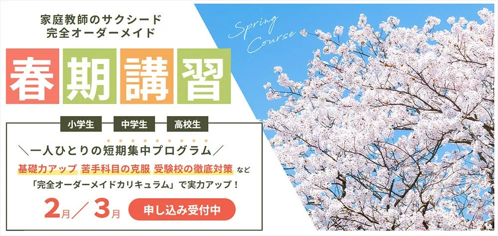 家庭教師のサクシードは、2025年度の春期講習の受付を開始しました。新しい学年を迎える準備を、この春に整えてみませんか?春休みは、学力を土台から固め、新学期に自信をもって臨むための貴重な機会です。そして、サクシードの家庭教師プログラムがそのサポートを提供します。