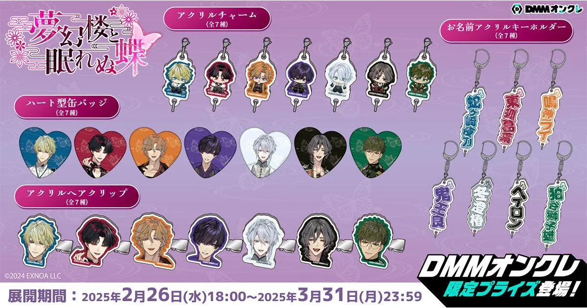 DMMオンクレでの「夢幻楼と眠れぬ蝶」限定グッズは、あなたのコレクションにぜひ加えたい魅力的なアイテムばかりです。2月26日から始まるこの限定企画をお見逃しなく!新たな恋の物語を、夢幻楼で紡ぎましょう。