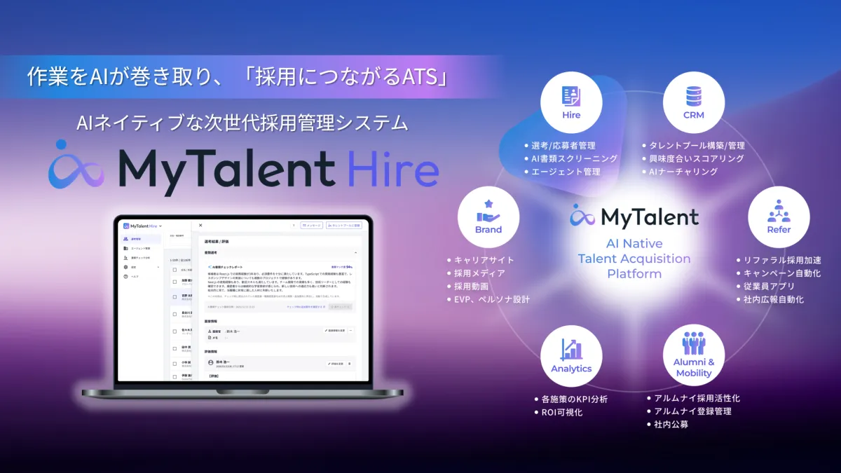 株式会社TalentX(東京都新宿区)は、新たなAIネイティブ採用管理システム「MyTalent Hire」を発表しました。このシステムは、従来の応募者進捗管理の考え方を一新し、採用を「掛け捨て型」から持続可能な経営資産に変革することで注目されています。
