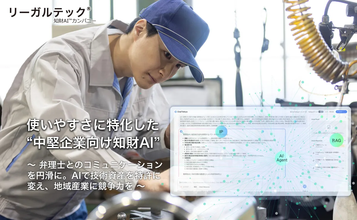 地方の製造業や技術系企業は、ここ数年深刻な知財人材の不足に直面しています。また、弁理士に依頼する際の高額な費用も問題であり、特許出願が行えないケースが増加しています。そのため、長年培った技術やノウハウが「埋もれた技術資産」となる危険性も少なくありません。この問題に対抗するため、リーガルテックは「地方製造業を知財で守り、発展させる」というメッセージのもと、現場の視点を取り入れたAIソリューションを展開しています。