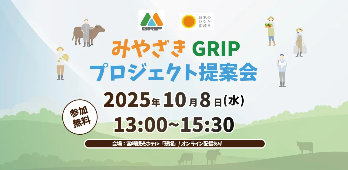 宮崎県が主導する「みやざきGRIP」は、持続可能な農林水産業の実現を目指したプロジェクトです。新たな事業の創出や参加者同士のマッチングを目的として、2023年10月8日(水)に第4回「みやざきGRIPプロジェクト提案会」を開催します。