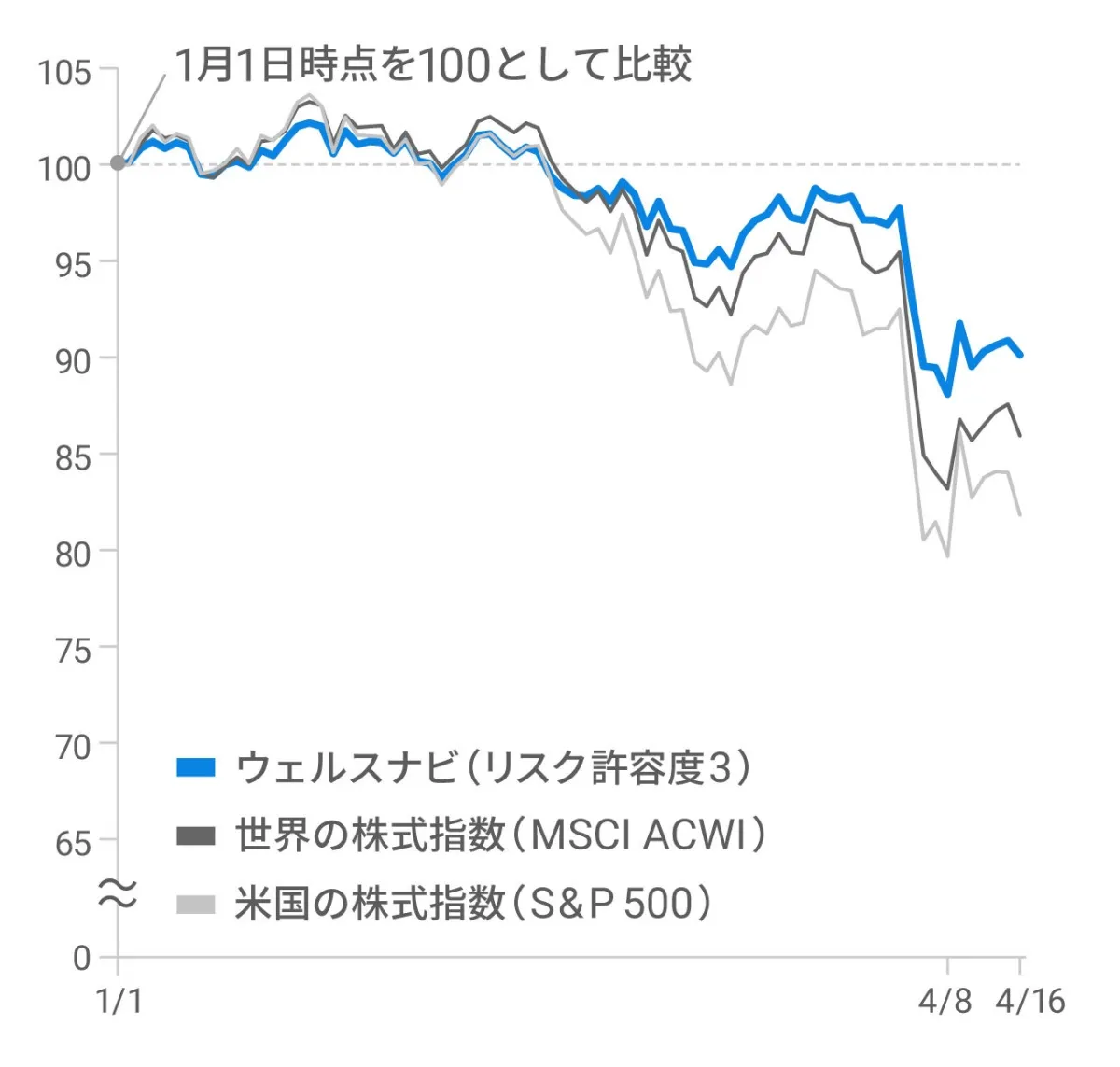 当社のロボアドバイザー「WealthNavi」を利用して資産運用を行った場合、株式・債券・金・不動産といった多様な資産を組み合わせることで、株式だけに投資する場合に比べて下落幅を抑えることができると確認されました。具体的には、2025年1月1日から4月中旬までの期間において、当社が提供する5つの運用プランの中から「リスク許容度3」のプランを用いて、米国株指数(S&P 500)や世界の株式指数(MSCIオール・カントリー・ワールド・インデックス)との比較を行った結果、ロボアドバイザーによる分散投資が際立った効果を示しました。