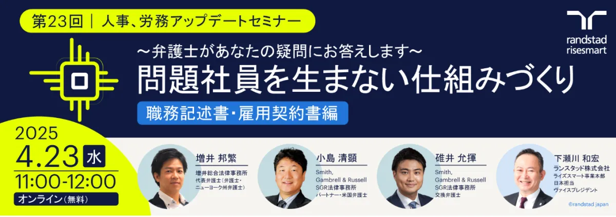 ランスタッド株式会社は、2025年4月23日(水曜日)に、オンラインで「人事、労務アップデートセミナー」を開催します。このセミナーでは、問題社員を未然に防ぐための具体的な施策について学びます。弁護士による解説と具体例を交えた内容となっており、特に「職務記述書」と「雇用契約書」に焦点を当てています。