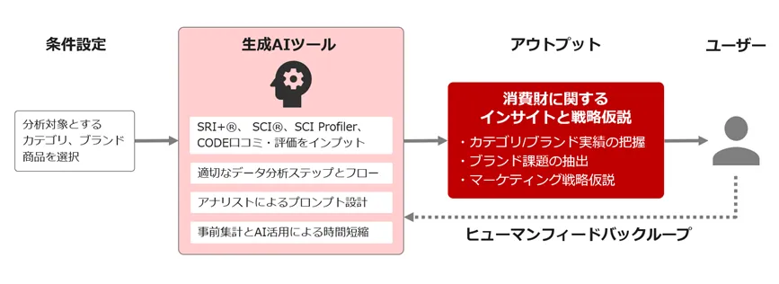 インテージが提供するデータセットは、約6000の小売店からのパネル調査(SRI+®)と、70000人の消費者からの調査データ(SCI®)を基にしています。このデータがインプットされ、生成AIが分析を行うことで、消費財市場におけるトレンドや消費者理解の深化が図られます。これにより、企業は市場での競争優位を築くための貴重なインサイトを得られます。