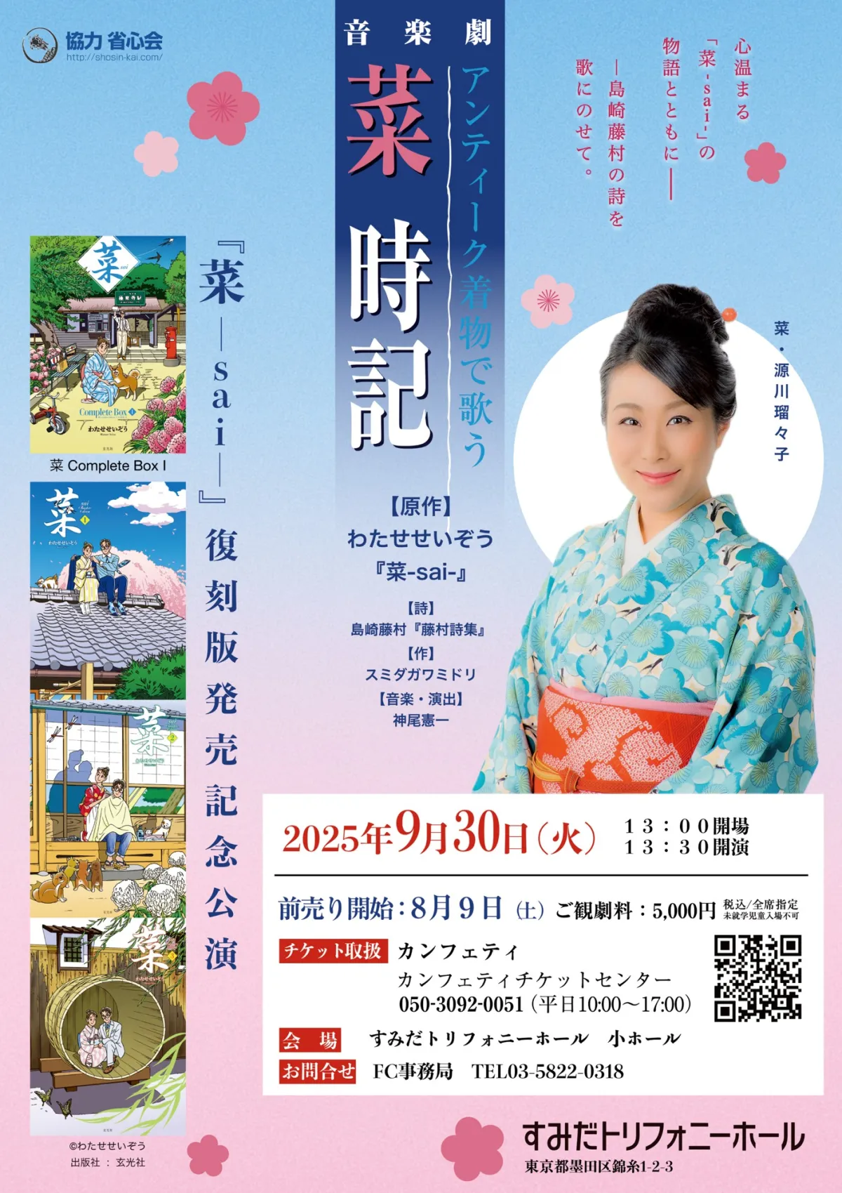 音楽劇『菜時記』が、2025年9月30日(火)に東京都墨田区のすみだトリフォニーホール 小ホールで上演されます。この公演は、著名なアーティスト、わたせせいぞう氏の名作『菜 - sai -』の復刻版を祝うために企画されました。主演を務めるのは源川瑠々子さんで、彼女の「お祝いしたい」という思いからこの舞台が実現しました。