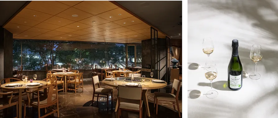 この特別なディナーでは、テルモンの上質なシャンパーニュと「王朝」の料理が見事なペアリングを叶えます。当日のコースには、三陸・吉浜産の干し鮑やローストビーフが用意され、それぞれに合ったシャンパーニュがしっかりとその食材の魅力を引き立てます。特に、ブリオッシュの香ばしさを際立たせたレゼルブ・ブリュット マグナムは、干し鮑の旨味と絶妙にマッチします。