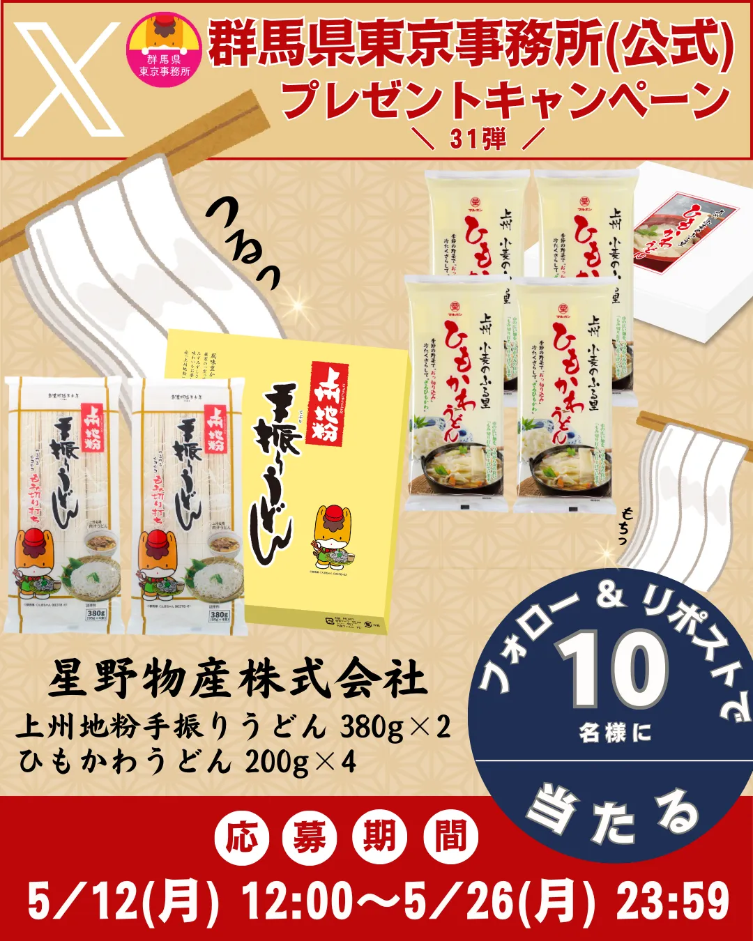 群馬県東京事務所が公式SNSを通じて、魅力的なプレゼントキャンペーン「群馬県東京事務所(公式)Xプレゼントキャンペーン第31弾」を開催中です。これは、群馬の美味しい地元産品を広めるための素晴らしい機会であり、特に注目すべきは、星野物産の「地粉手振りうどん」と「ひもかわうどん」のセットが抽選で10名に当たるという点です。