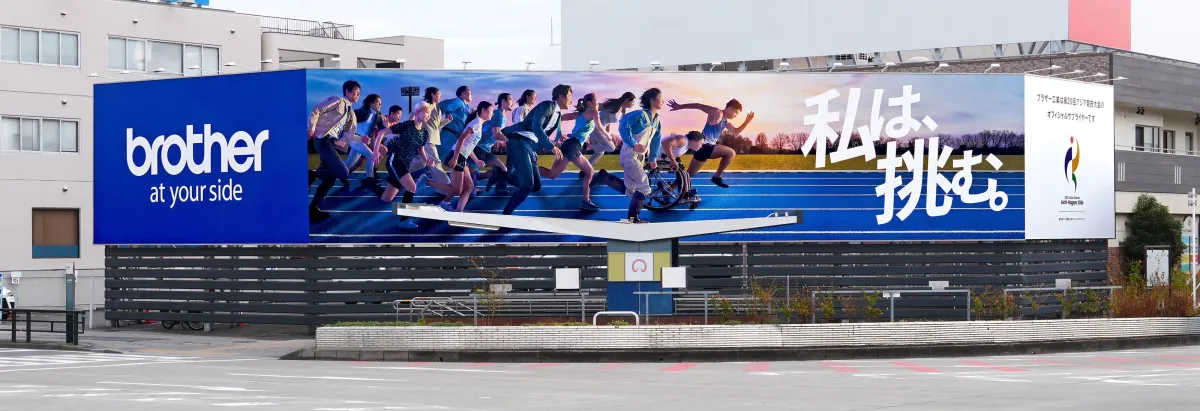 この新しい看板の中央には、アジア競技大会および第5回アジアパラ競技大会の特設サイトと連動したキービジュアルが配置されています。キービジュアルは、アスリートが自らの限界に挑戦する姿や、起業家が社会の常識を打破する様子を象徴しています。また、ブラザー工業が長年大切にしている「At your side.」という理念が体現されており、挑戦する人々の側に寄り添う存在でありたいという思いが込められています。