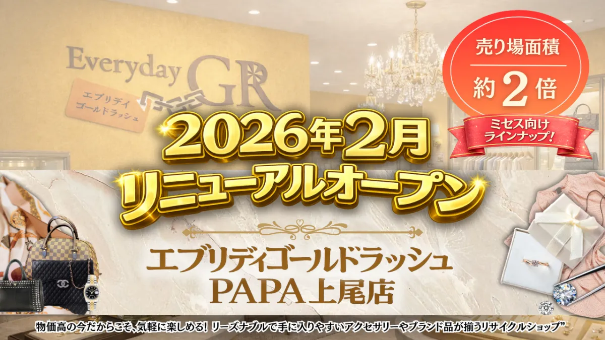 埼玉県内で8店舗を展開するリサイクルショップ「エブリデイゴールドラッシュ」は、2026年に創業40周年を迎えるにあたり、2月14日にPAPA上尾店をリニューアルオープンします。これまでの「買取専門店」から、ミセス層向けのリサイクルショップへと進化したことで、物価高の影響を受ける現代のおしゃれ需要に応える姿勢を強めています。