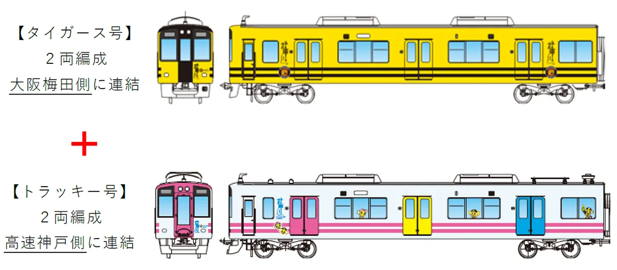 - - 特別運行には、4両1編成の「タイガース号」と「トラッキー号」が連結されています。これらの車両は、2020年6月から運行されており、外装には阪神タイガースや阪神甲子園球場をテーマにしたデザインが施されています。