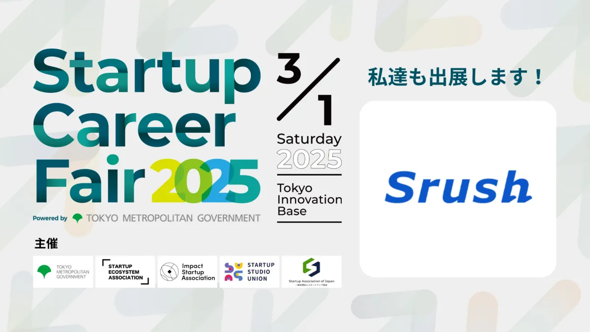 Srushは、13:00から14:00の間に3分間の会社紹介を行うショートピッチを予定しています。また、出展ブースエリアではWEST 43ブースにて、来場者の皆さまをお迎えします。