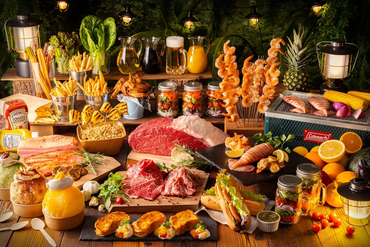 「サマーガーデンバーベキュー」では、時間制限なしの食べ放題と飲み放題が楽しめます。特に、上質な和牛を始め、新鮮な帆立や海老、いかといった海の幸を炭火で焼きあげ、素材の旨みを最大限に引き出します。また、焼きそばやスープ、カレーといったバラエティ豊かなメニューもビュッフェスタイルで提供され、彩り豊かなジャーサラダもお楽しみいただけます。