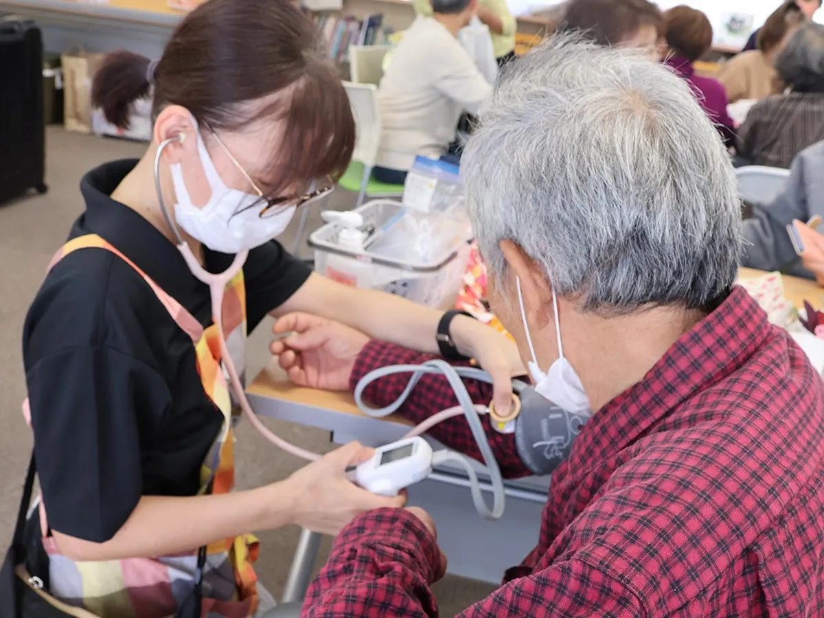 今回の健康チェック会には、医師、看護師、作業療法士が参加します。具体的には、医師による問診と健康チェックに加えて、作業療法士が立ち上がりのチェックや認知機能の確認を行います。さらに、日常生活に関する身体の困りごとをヒアリングし、住民の皆さんとの個別コミュニケーションを大切にします。