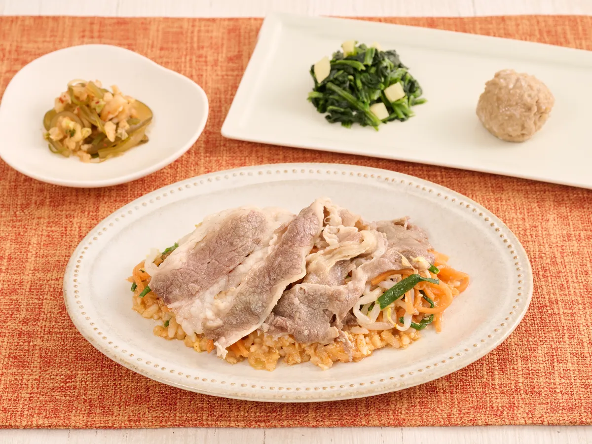 「牛肉の旨辛スタミナクッパ」に添えられる副菜は、茎わかめのコリコリとした食感がアクセントの白菜の甘辛煮、さっぱりとしたほうれん草の和え物と、麹の旨みでいただく肉団子の塩麹だれです。これらの副菜は、主菜との相乗効果で食事全体の満足度を高める役割を果たします。