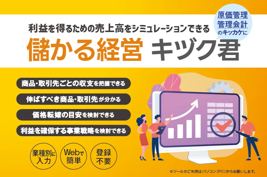新しいツール『儲かる経営 キヅク君』は、中小企業が収益を最大化し、効果的な経営戦略を立てるための力強い味方となるでしょう。特に、さまざまな状況下での価格転嫁の必要性をシミュレーションし、適正な価格設定を促進することが期待されています。この機会に、ぜひ『儲かる経営 キヅク君』を活用してみてください。