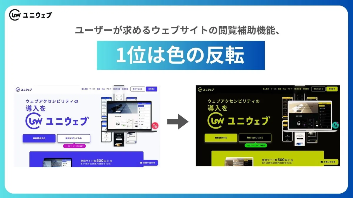 調査の結果、ユーザーが最も頻繁に利用する機能の上位3つは「色の反転」「スマートコントラスト」「ダークコントラスト」でした。これらの機能は視覚的な支援に特化しており、特に色弱の方々にとって大きな助けとなるとされています。これにより、日常的にウェブサイトを利用する上でのストレスを軽減し、快適な閲覧が可能となっています。