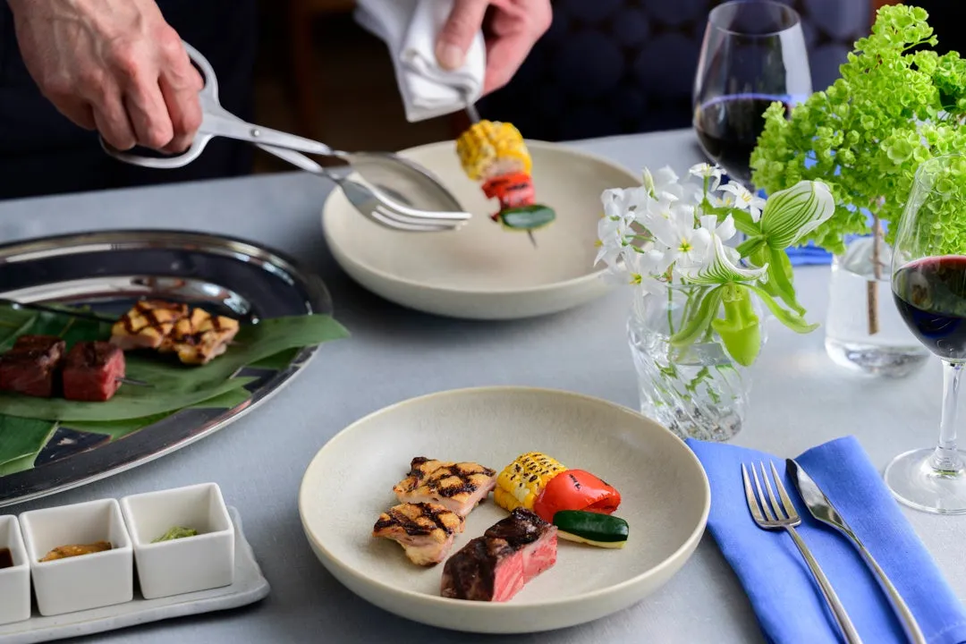 その中でも特に注目すべきは、シンプルでありながら素材の魅力が引き立った「3種のブロシェット」です。信州プレミアム牛フィレ、信州黄金シャモのタンドリー、旬の信州野菜が各自の特徴を活かして串焼きの形で提供され、ゲストの目の前で焼き加減を調整します。この体験は、臨場感あふれるひとときとなることでしょう。