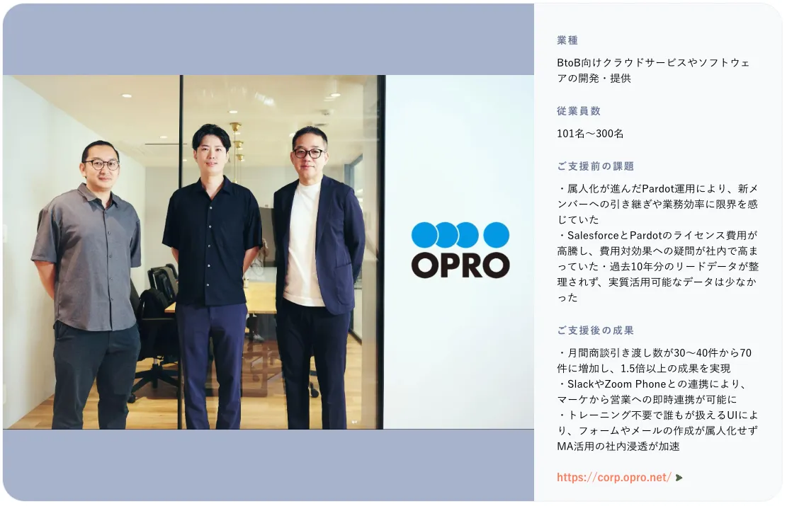 オプロはBtoB向けのクラウドサービスを提供する企業であり、Salesforceの旧Pardotを利用していたものの、運用の属人化が進行し、どの担当者もが容易に利用できる環境が整っていませんでした。特定の担当者がフォームやメールの作成を行うことが多く、そのために新メンバーの立ち上がりにも時間がかかりがちでした。