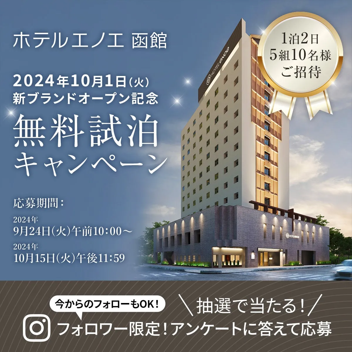 - - 応募条件: ホテルエノエ公式Instagram(@hotel_enoe)をフォローし、アンケートに回答