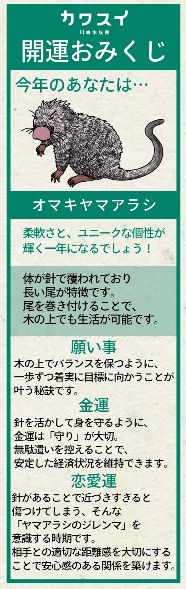 毎年恒例のオリジナル開運おみくじが、2024年12月20日から2025年1月31日の期間中に販売されます。生きものたちにちなんだおみくじは、全16種類のデザインがあり、運勢を占うだけでなく、生きものの知識や魅力も同時に楽しめる内容です。
