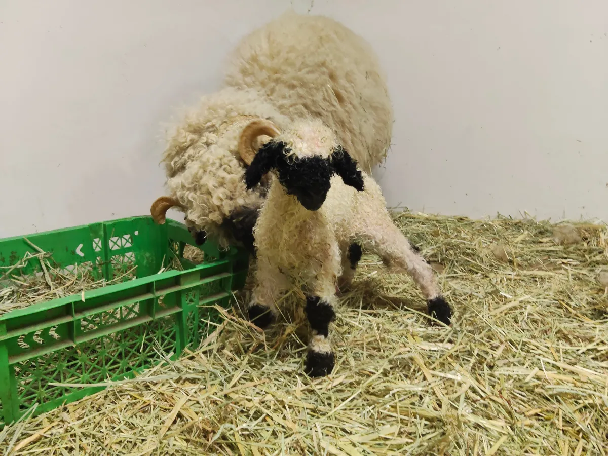 この羊はスイスのヴァレー州が原産で、白と黒の毛色が特徴です。さらに、長い毛足とまあるい顔が可愛さを引き立てています。2026年の3月22日に誕生したこの女の赤ちゃんは、誕生時の体重が約4,500g。母親は初の出産ながらも元気な赤ちゃんを育てています。動物係の見守りの下、お乳を飲みながら元気に成長している姿は、訪れる人々の心を温かくします。