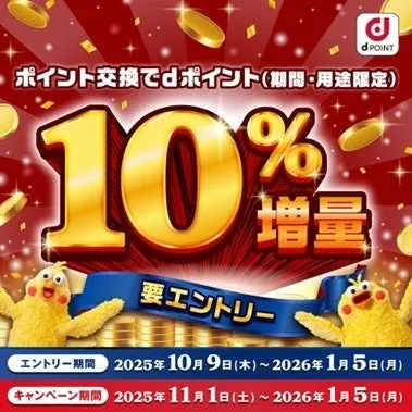 NTTドコモが、2025年11月1日から2026年1月5日までの期間に「ポイント交換でdポイント10%増量キャンペーン」を実施すると発表しました。このキャンペーンでは、特定企業が提供するポイントをdポイントに交換すると、もれなく10%の増量が適用されるという内容です。この機会に多くの人がdポイントを賢く利用できることが期待されています。