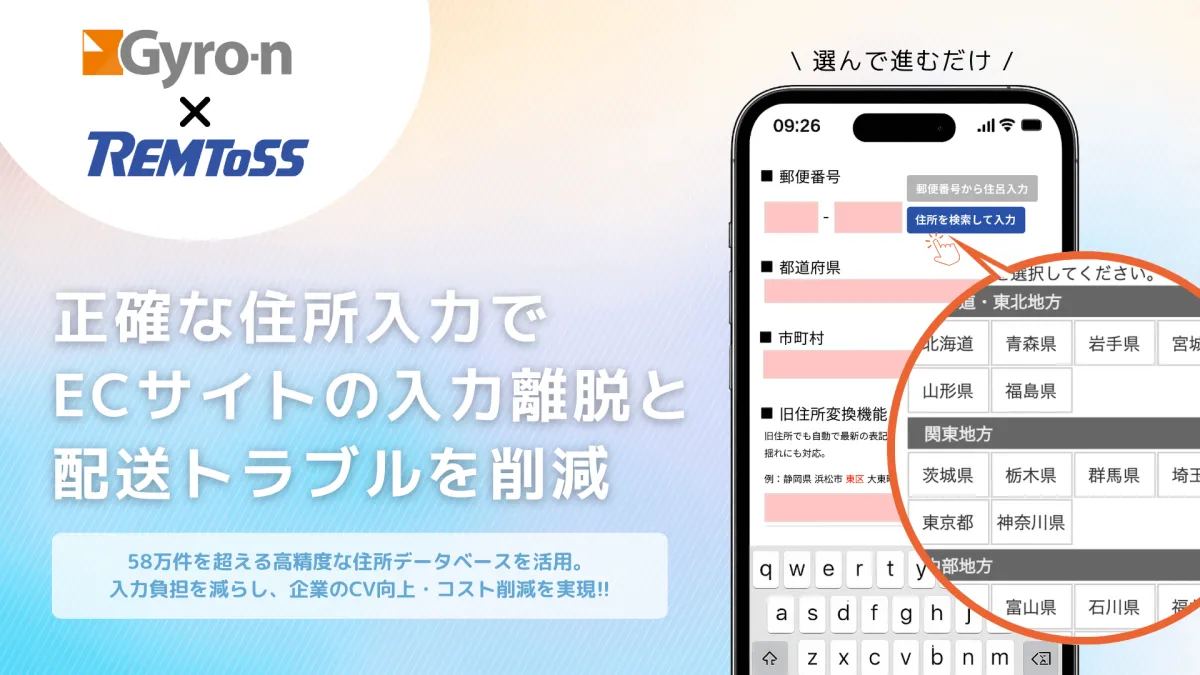 「Gyro-n EFO」は、入力フォームの最適化を実現するツールです。このツールは2025年5月20日より、株式会社レムトス提供の高精度住所入力支援サービス『辞書屋のWebSolution』との連携を開始しました。この連携により、誤入力の軽減や、スムーズな住所入力が可能になります。