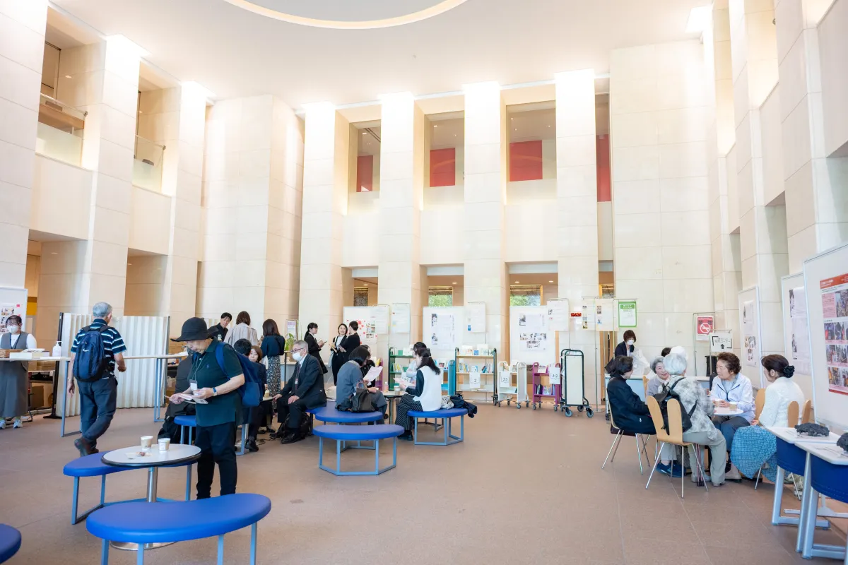 「ブックカフェ125」は、文学部がこれまでに残した125冊の著作から選ばれた本を来場者に手に取ってもらうことで、旧友との再会や懐かしい思い出を共有する場として設けられました。空間デザインには、2024年度に設立された建築デザイン学部の学生たちが関わり、百年館高層棟のエントランスを「カフェエリア」、泉プロムナードを「ピクニックエリア」として区分けした、個々の好みに合わせて楽しむことができるフレンドリーな空間が整えられました。