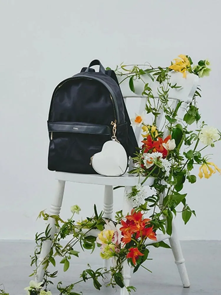 次に紹介するモデルは、TONALが別注した「バックルリュック」です。このリュックは、光沢のあるツイル素材とゴールドパーツの組み合わせが特徴で、上品さを際立たせています。バッグのサイズは、高さ40cm、幅32cm、マチ14.5cmで、持ち手の長さは51cmから94.5cmまで調整可能です。何より、コンパクトでありながら収納力が高く、PCやA4サイズのアイテムも楽に収まります。