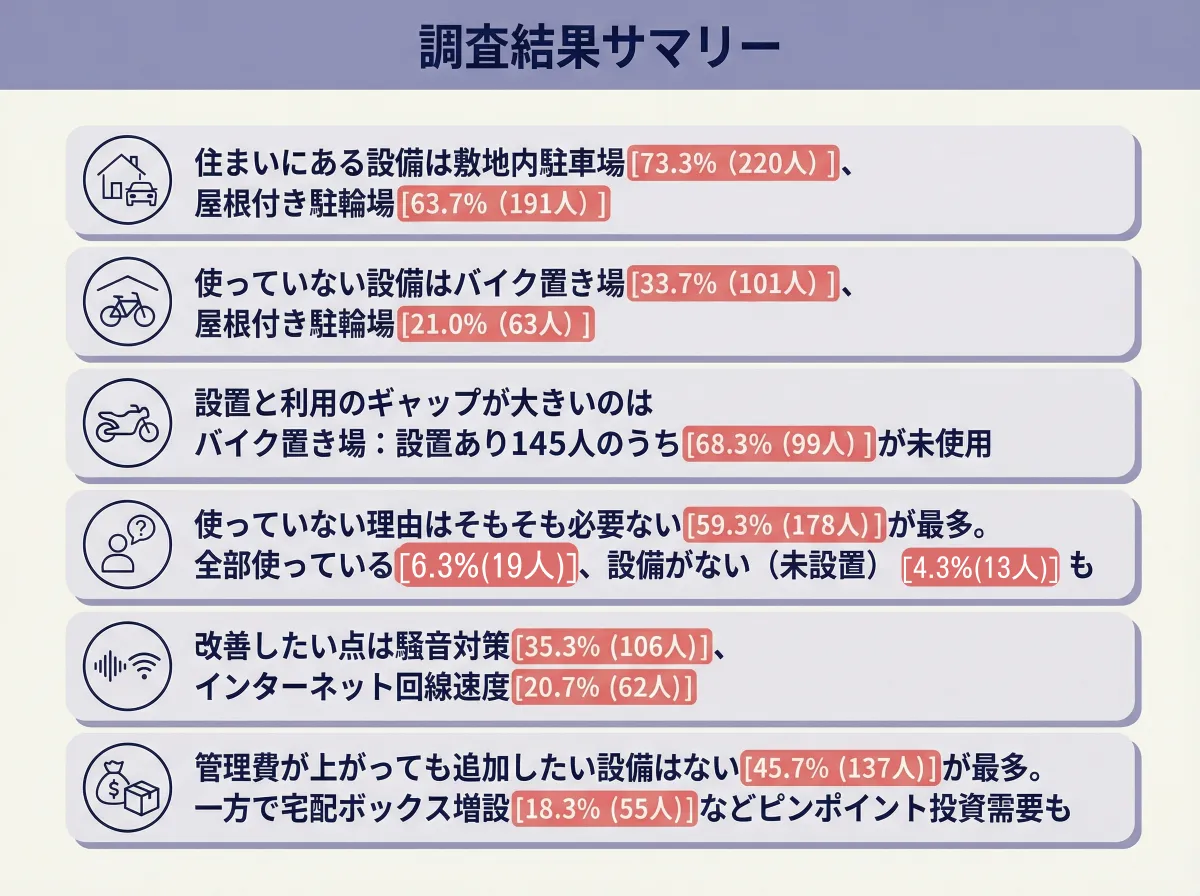 調査の結果、最も使われていない設備にランクインしたのは「バイク置き場」で、全体の33.7%にあたる101人が使用していないと回答しました。特にバイク置き場を設置している145人の中では68.3%(99人)が活用していないとのこと。このデータは、実際の住民のニーズと供給に大きなギャップが存在していることを示唆します。