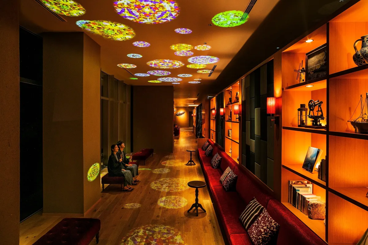 長崎は1570年に開港以来、ポルトガルとの交易によって発展し、欧州のガラス文化が根付いた都市です。特に「大浦天主堂」は、日本に現存する最古のキリスト教建築であり、そのステンドグラスには長い歴史が宿っています。「界 雲仙」ではこの歴史に敬意を表し、大浴場や客室にもステンドグラスとビードロ(吹きガラス)を使用したデザインを取り入れています。このラウンジでは、唯一「大浦天主堂」のステンドグラスの修復を担当するガラス工房「瑠璃庵」から譲り受けた端材を使い、光と万華鏡の演出を融合させることで、まるで魔法のような光のシンフォニーを生み出しています。これにより、「和華蘭文化」とも呼ばれる長崎の独特な文化的背景に繋がり、来客に深い感動を与えてくれます。