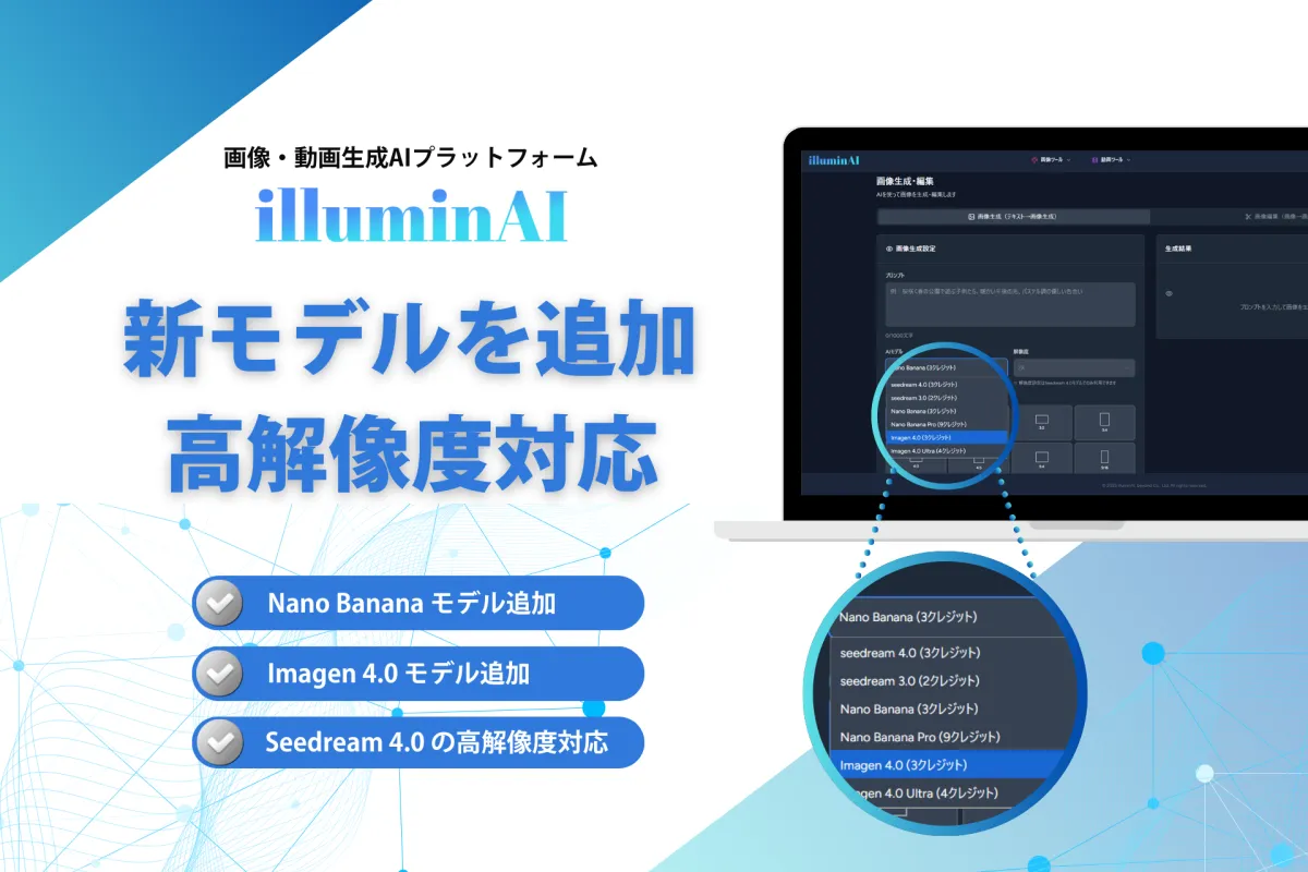 今回のアップデートにより「illuminAI」は、さまざまなクリエイティブなニーズに応える力を大幅に強化しました。特に、多様なモデルと高解像度対応が加わったことで、プロフェッショナルユーザーからカジュアルユーザーまで、幅広い層のユーザーにとって使いやすいプラットフォームへと進化しています。