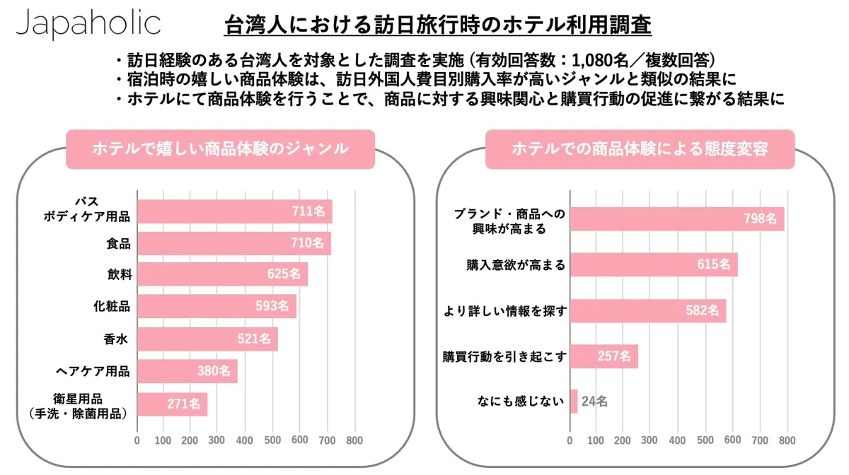 日本情報発信メディア「Japaholic」が実施した調査によれば、ホテルでの試供品について「バス・ボディケア用品」や「食品」に関心が高いとされ、特に台湾人観光客はホテルでの商品の体験を通じてブランドへの興味が高まるという結果が出ました。831名の参加者のうち、798名が「ブランド・商品への興味が高まる」と回答しており、この反応は「ワタセル」の効果を証明しています。
