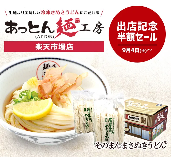 初出店を記念して、9月4日から先着500名さまに限定した半額セールを実施しています。是非このチャンスを活かして、あっとん麺工房の本格讃岐うどんをお試しください。