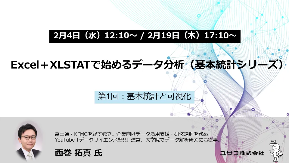 ユサコ株式会社が2026年に開催する「Excel+XLSTATで始めるデータ分析(基本統計シリーズ)」は、データ分析を始めたい方にピッタリの無料オンラインセミナーです。このセミナーは、Excelを用いてデータ処理を基礎から学ぶことができます。特に、データサイエンスに関する知識がまだ浅い方や、これから独学で進めようとしている方にとって非常に有益な内容となっています。