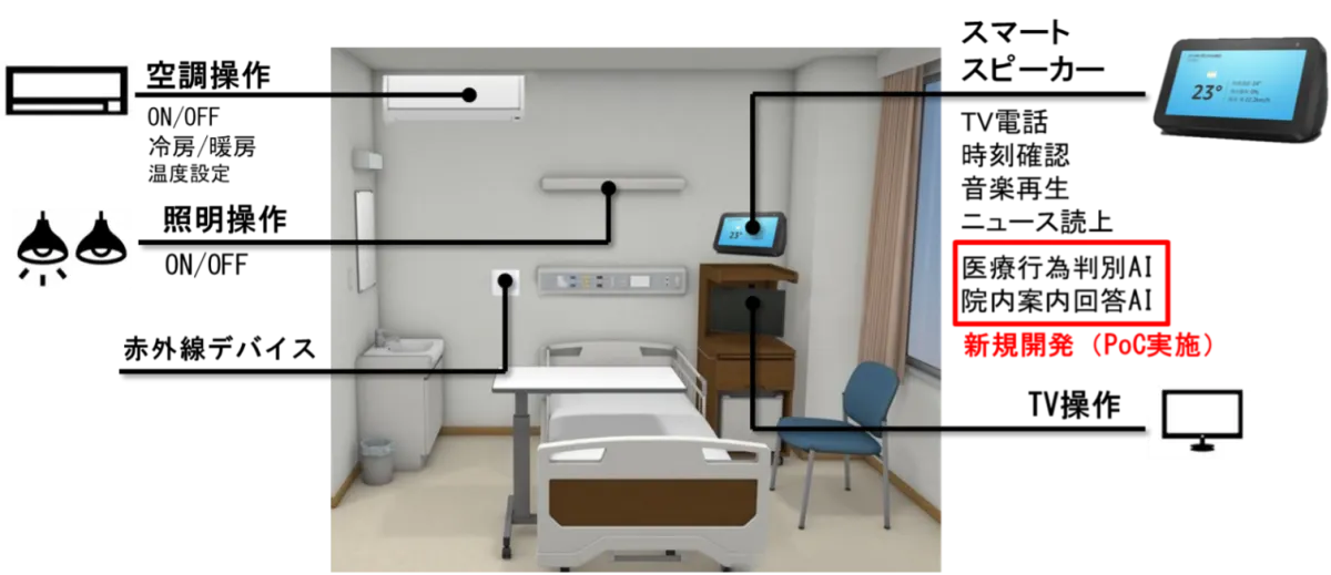 この新システムでは、AmazonのAlexa Smart Propertiesを使用し、病院内の設備を音声で操作することが可能です。具体的には、患者が発した音声に対してAIが医療行為か否かを判断し、もしそれが生活支援であれば、AIが自動で応答し、看護スタッフを介さずにその要望を実現します。これにより、医療従事者の負担を軽減することが期待されています。