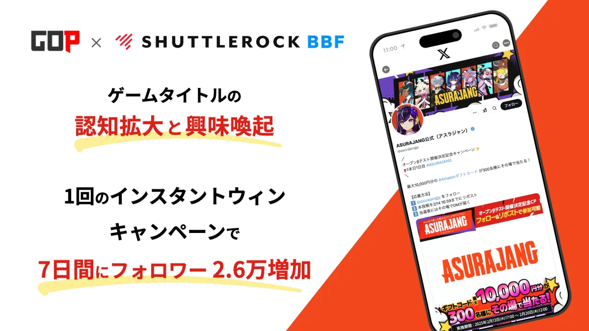 ゲーム業界で注目を集める新感覚アニメチックバトルロイヤルゲーム『ASURAJANG(アスラジャン)』を開発した株式会社G・O・Pは、最近、シャトルロックジャパン株式会社の提供したキャンペーンツール「Shuttlerock BBF for X」を導入し、その効果を実証しました。このキャンペーンでは、わずか1週間で新規フォロワーを2.6万人も獲得するという快挙を成し遂げました。