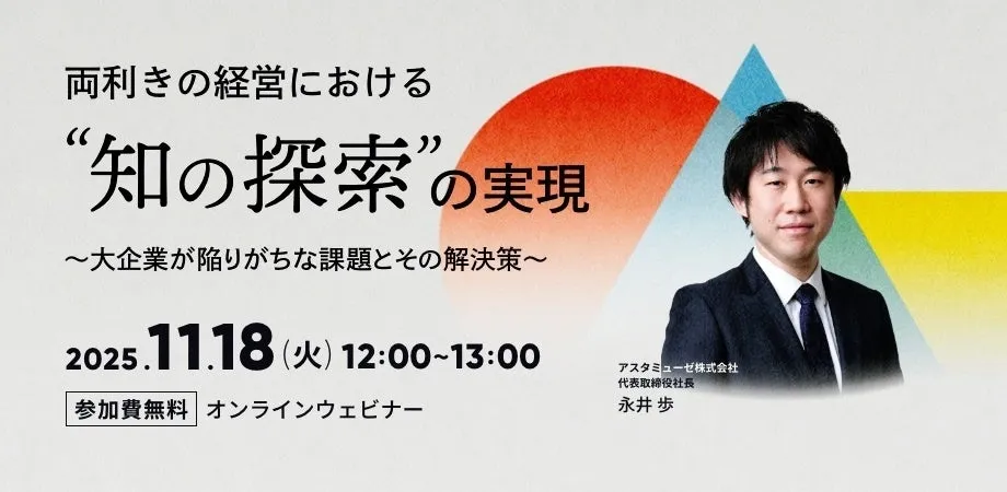 アスタミューゼ株式会社が主催する、新作ウェビナーが再開催されます。今回は、「両利きの経営における『知の探索』の実現 ~大企業が陥りがちな課題とその解決策~」というテーマです。開催は2025年11月18日(火)12:00から1時間の予定で、オンラインプラットフォームZoomを利用して行われます。