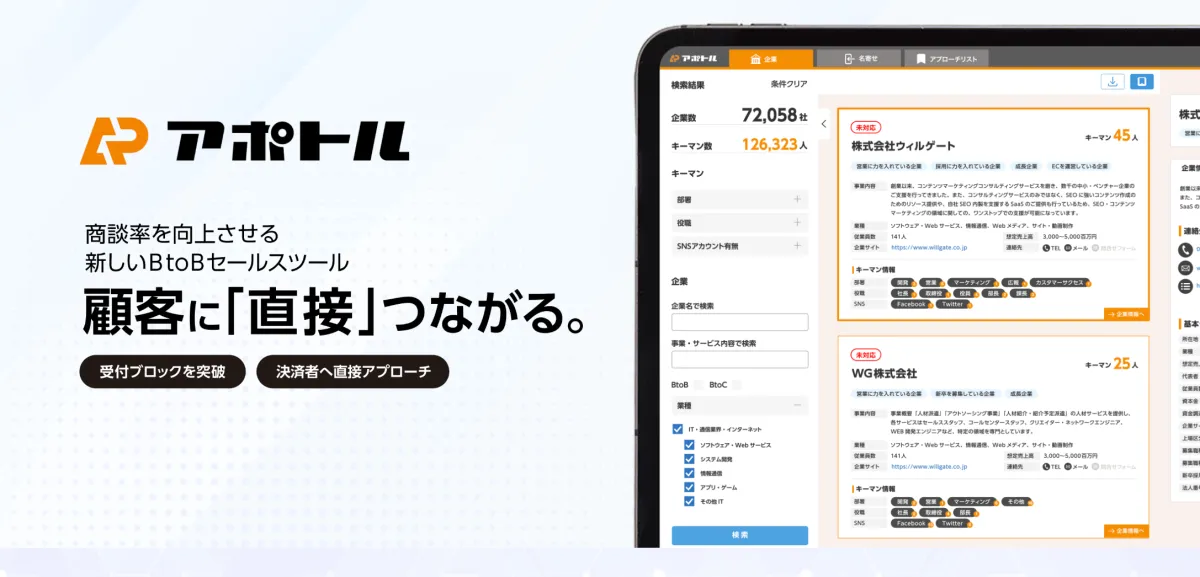 新しいBtoBセールスツール『アポトル』は、ウィルゲートが提供しており、SNSを活用してキーマンにアプローチすることが可能です。法人営業において、アポイント獲得にお困りの方はぜひご検討を。