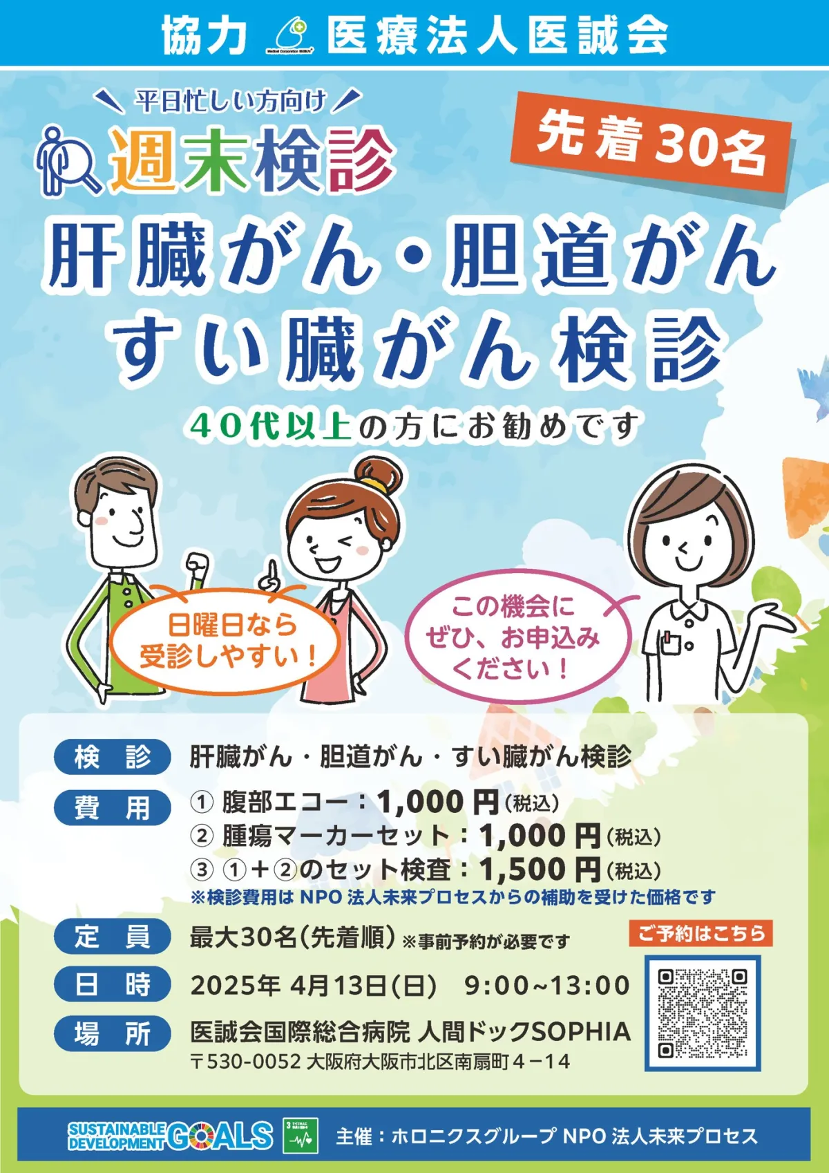 大阪市に位置する医誠会国際総合病院では、4月13日(日)に「肝臓・胆道・膵臓がん検診」を開催します。この検診は、忙しい方々に向けて週末の時間を利用して受けられることが特徴で、参加希望者には事前予約が必要です。先着30名限定ということもあり、早めの申し込みが推奨されています。