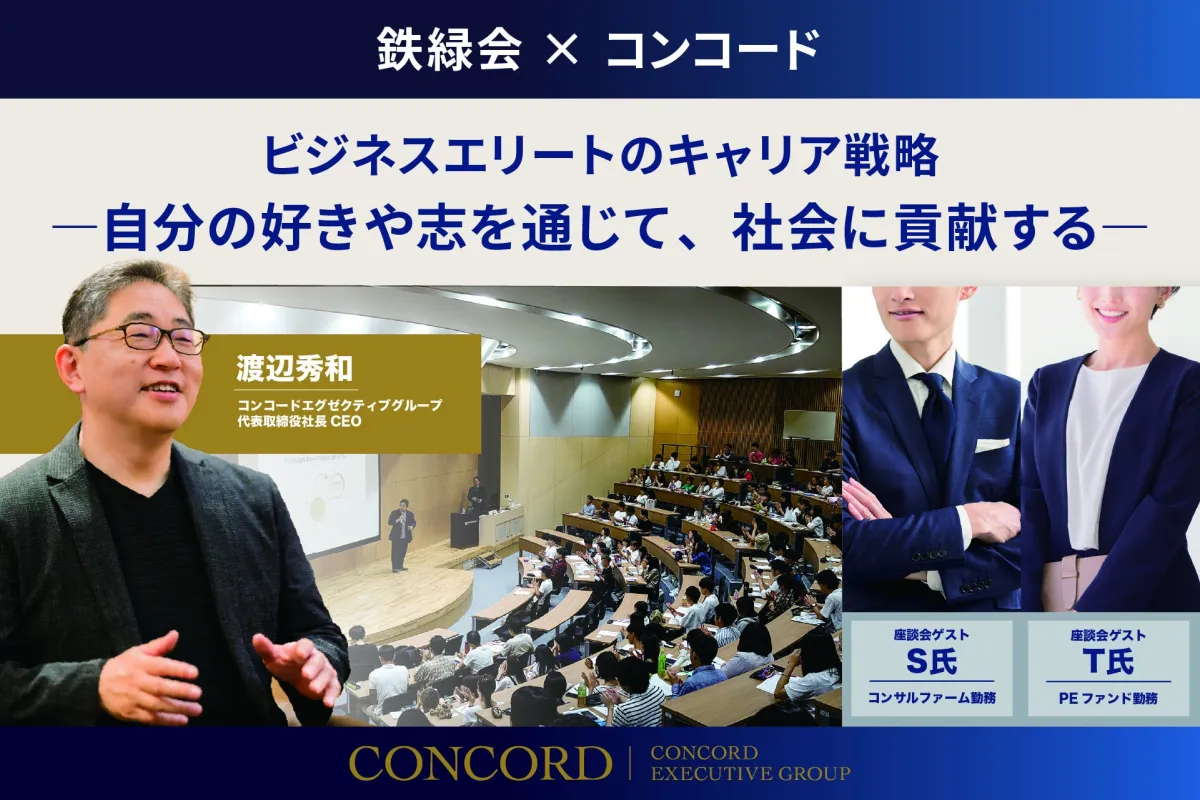 2025年1月19日(日)、東京の名門進学塾である鉄緑会とキャリアデザイン専門のコンコードエグゼクティブグループが共同で、「ビジネスエリートのキャリア戦略―自分の好きや志を通じて、社会に貢献する―」という特別キャリアセミナーを開催しました。今回は鉄緑会で講師を務める学生を対象に、キャリア形成に関する貴重な知見が伝えられました。 鉄緑会は東京大学や国公立大学医学部への圧倒的な合格実績を誇る進学塾であり、参加した学生たちの高い意識と意欲が印象的でした。
