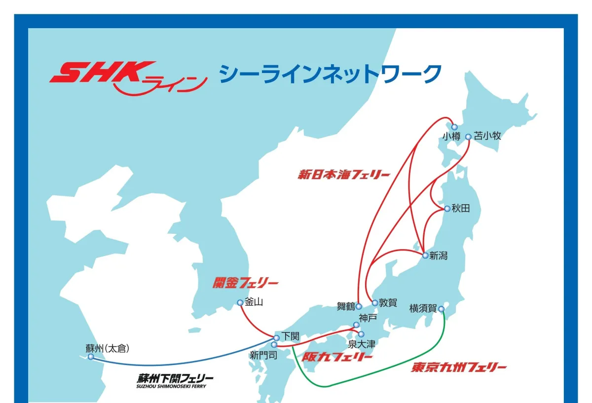 SHKライングループの構成には、関光ロジNEXT、新日本海フェリー、阪九フェリー、関釜フェリーなどが含まれています。これらは貨物利用運送と貨物自動車運送事業を展開し、総合物流としての「シーラインネットワーク」を形成しています。このネットワークを使うことで、中国・韓国と日本国内の物流を効率的に結びつけ、フェリー輸送を通じてカーボンニュートラルへの貢献を図ることができます。