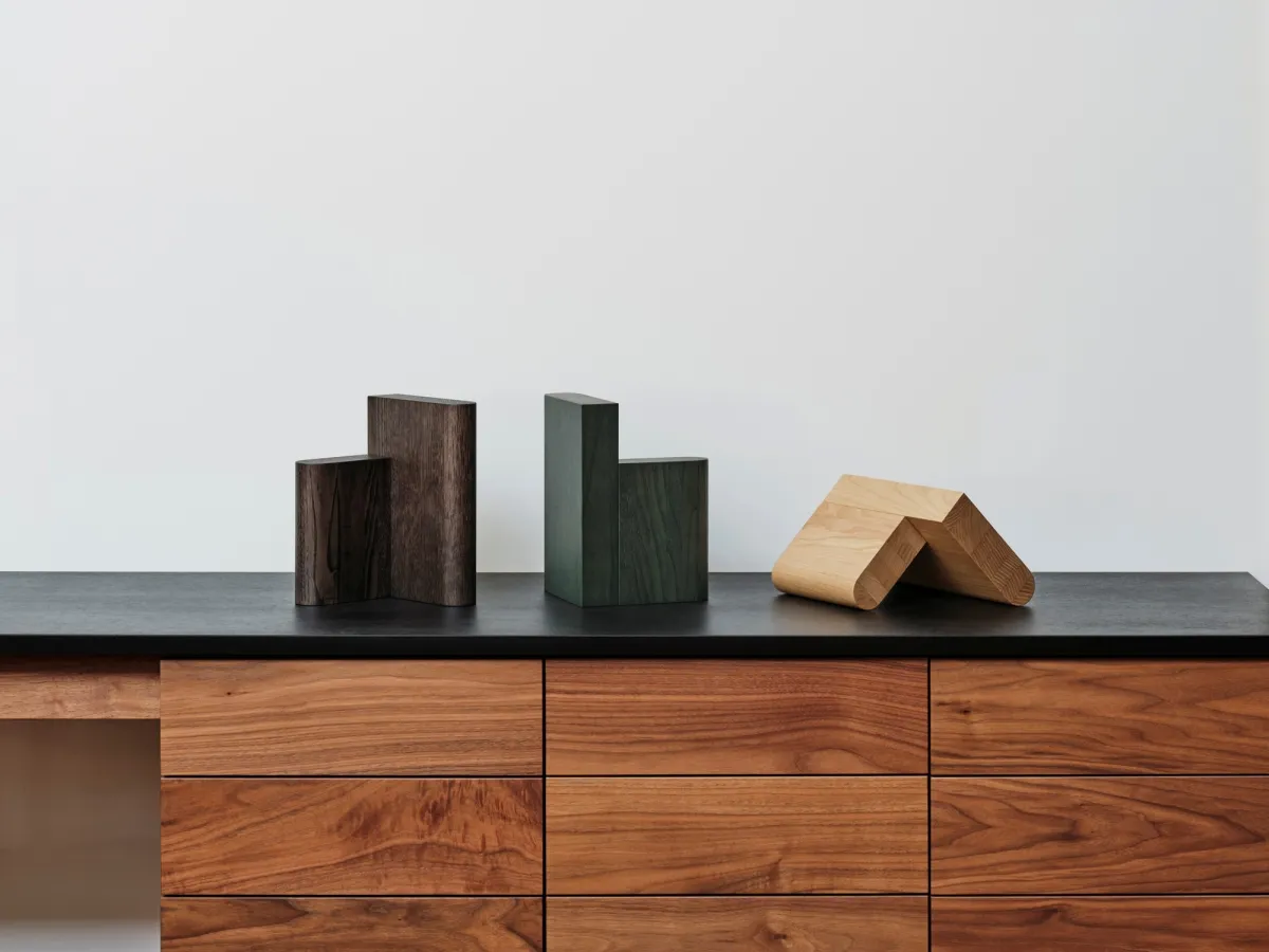 木製ブックエンドのデザインは、文庫本や学術書を美しく支えることに重点を置いています。独特の形状は書籍やアートブックを安定させるだけでなく、横置きにすることで読みかけの本を置くためのブックレストとしても機能します。